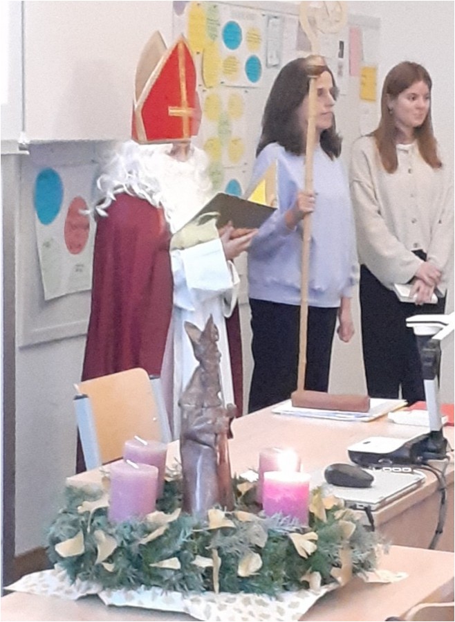 Mit den Liedern „Sei gegrüßt, lieber Nikolaus, wieder gehst du von Haus zu Haus“ (D. Jöcker / R. Krenzer) und „Lasst uns froh und munter sein“ (J. Annegarn) stimmten die Studierenden der Klassen G1 und G2 feierlich auf seinen Besuch ein. Adventliche Gedanken und besinnliche Geschichten, vorgetragen von den Studierenden, umrahmten die feierliche Nikolausstunde.